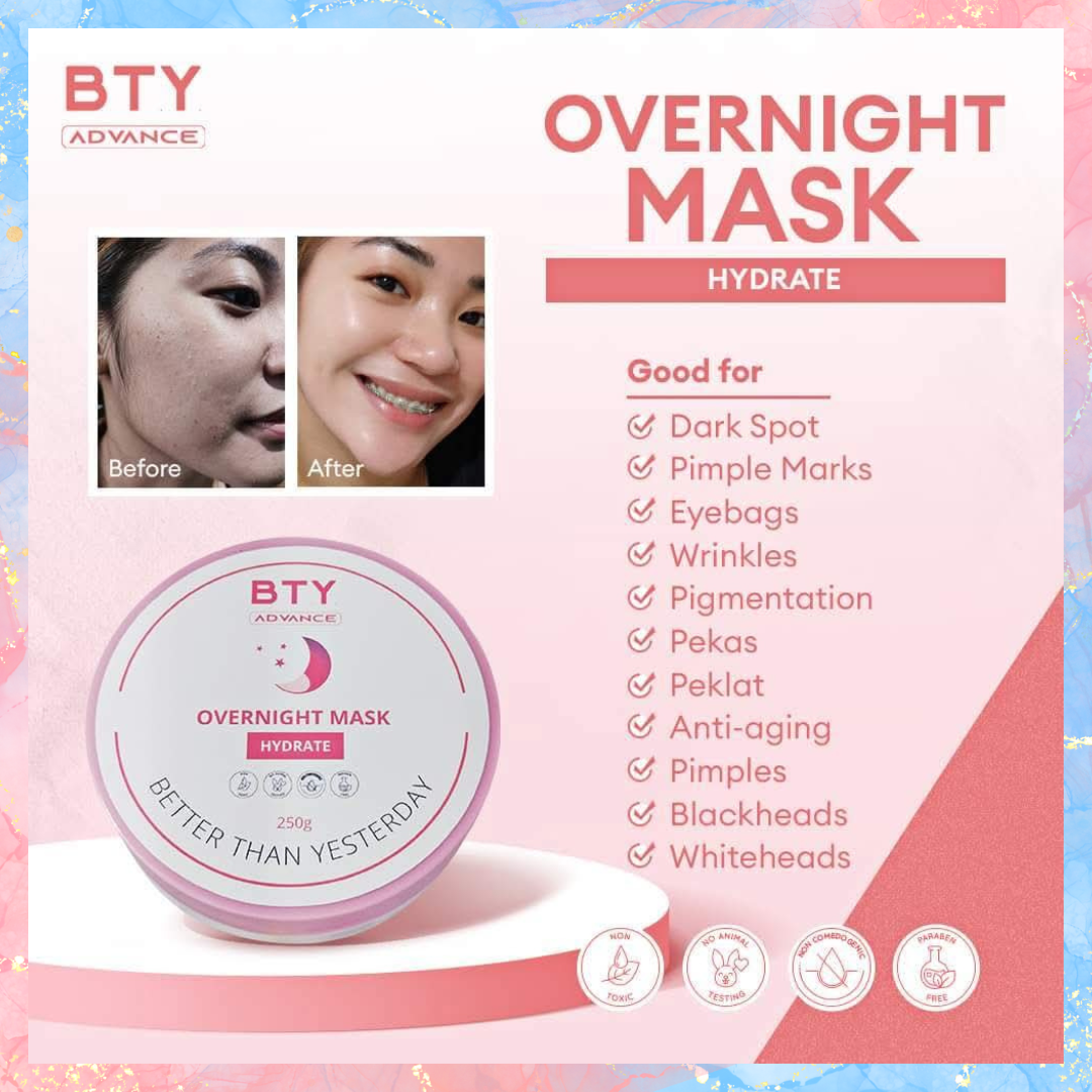 Achieve glowing and glass skin without the pain with BTY Advance Overnight Mask! This super mild and gentle mask is perfect for reducing pore size, lightening pimple marks, and providing intense hydration. Suitable for teens, pregnant and lactating women.