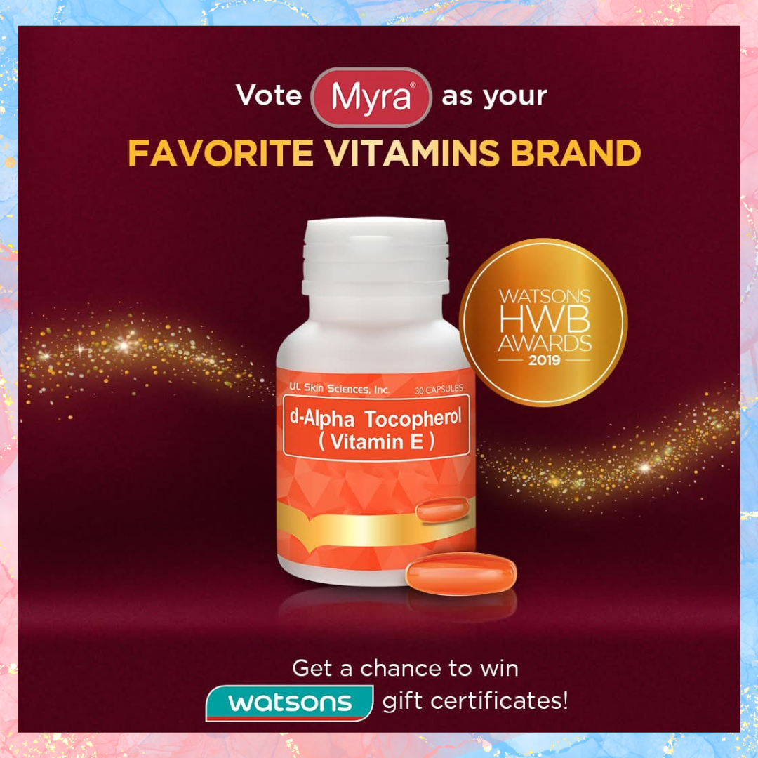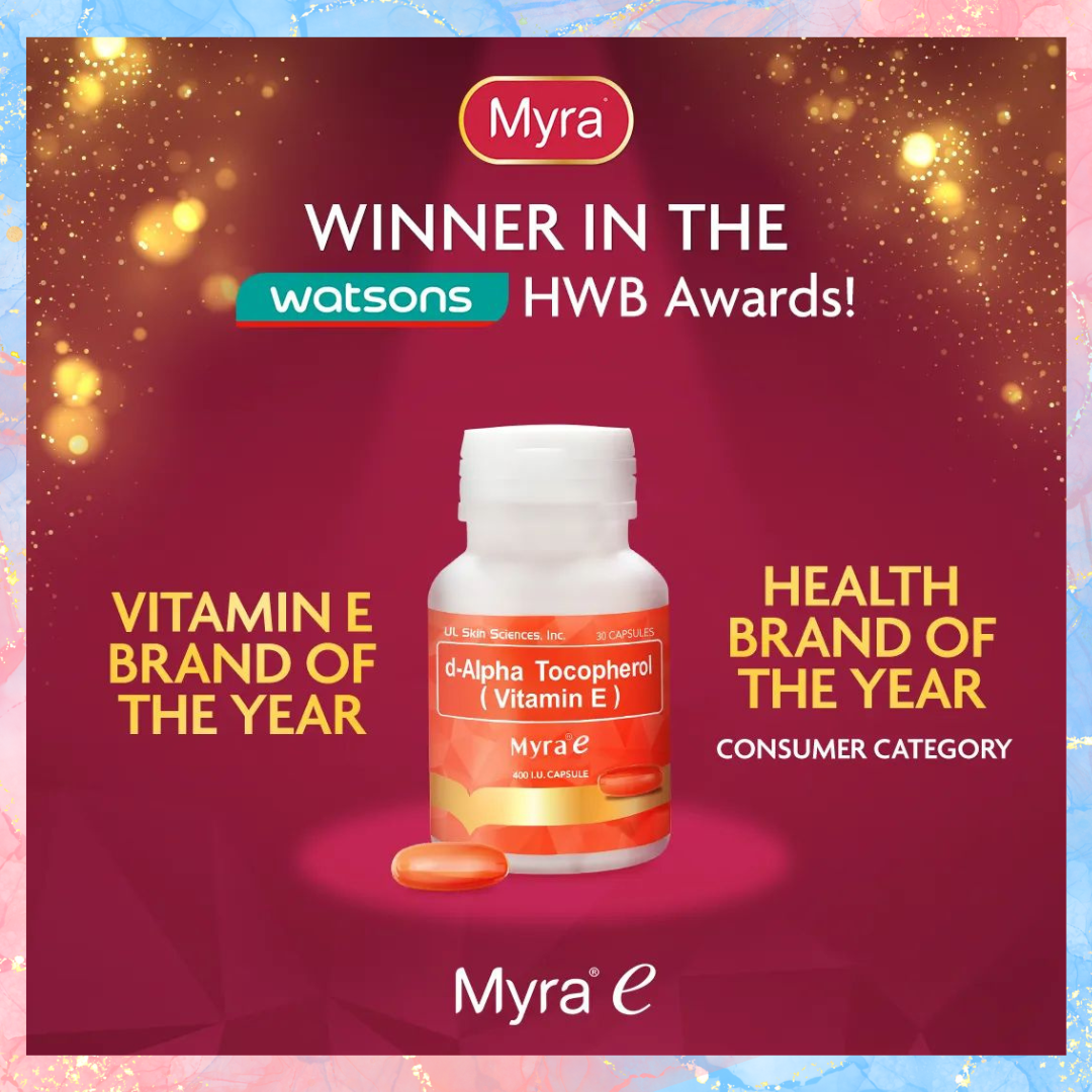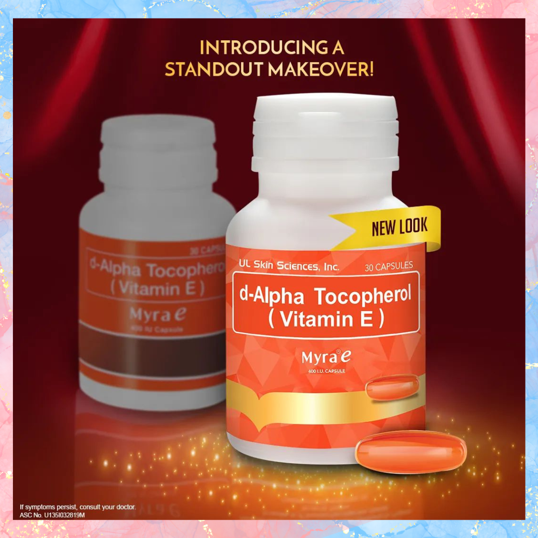 Stress, pollution, and unhealthy lifestyle produce free radicals. These free radicals steal life from one cell to the next, causing a chain reaction of damage. Damaged and unhealthy cells result to dull, tired- looking skin that has no glow. d-Alpha Tocopherol (Myra 400-E) is made out of natural Vitamin E from soybean oil which is a powerful antioxidant that helps remove harmful free radicals and promote cell and tissue renewal of the skin, lungs, muscles and liver.